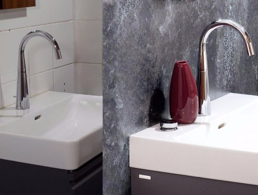 Fliesensanierung des Waschtischbereiches in der Kundentoilette eines Gasthauses.Die 3 mm Sanierungsrückwände Kompakt im Dekor Grafit und Sichtbeton wurden am ersten Arbeitstag fertig verlegt und verfugt, am zweiten Arbeitstag wurde der selbe Waschtisch wieder montiert.
