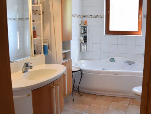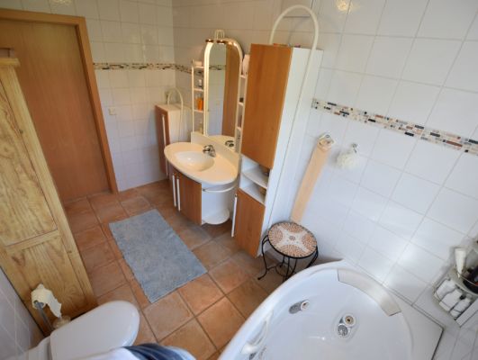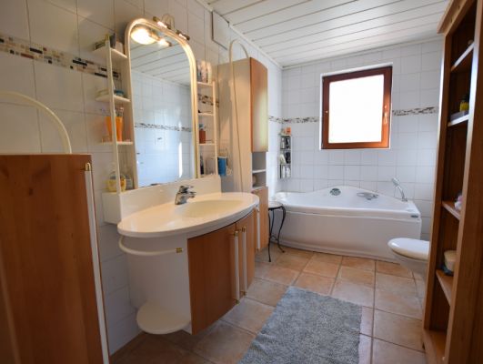 Badezimmer Sanierung mit Badewanne, Dusche, Möbelwaschtisch und Sprossenheizkörper. Die Verlegung erfolgte Raumhoch bzw. bis zur Dachschräge.Hergestellt mit Duschrückwandplatten 8 mm Universal,