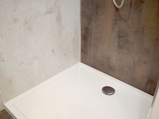 Badezimmer Renovierung eines Holzhauses.Die 8 mm Duschrückwände im Dekor Effektputz wurden direkt über die Holzwände verlegt.