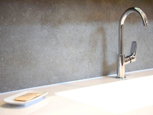 Verkleidung der Küchenrückwand mit 8 mm Platten. Die Latexfarbe darunter hatte nach zwei Jahren ausgedient und blieb unter den Erwartungen der Kunden.8 mm Duschrückwand Universal, Dekor Schiefer Platingrau