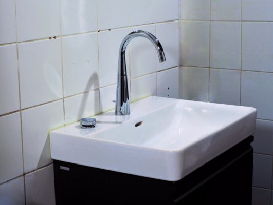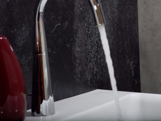 Fliesensanierung des Waschtischbereiches in der Kundentoilette eines Gasthauses.Die 3 mm Sanierungsrückwände Kompakt im Dekor Grafit und Sichtbeton wurden am ersten Arbeitstag fertig verlegt und verfugt, am zweiten Arbeitstag wurde der selbe Waschtisch wieder montiert.