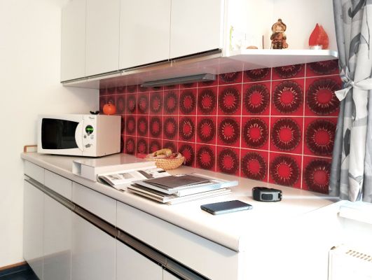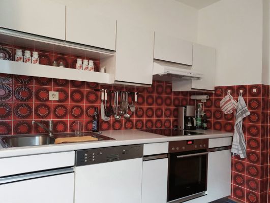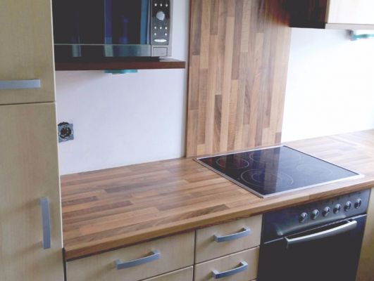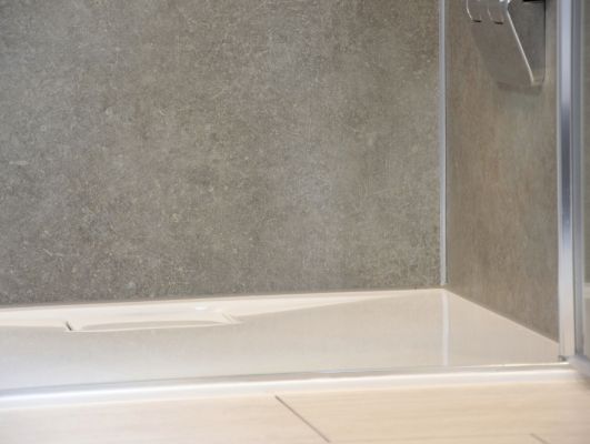 Verkleidung der Küchenrückwand mit 8 mm Platten. Die Latexfarbe darunter hatte nach zwei Jahren ausgedient und blieb unter den Erwartungen der Kunden.8 mm Duschrückwand Universal, Dekor Schiefer Platingrau